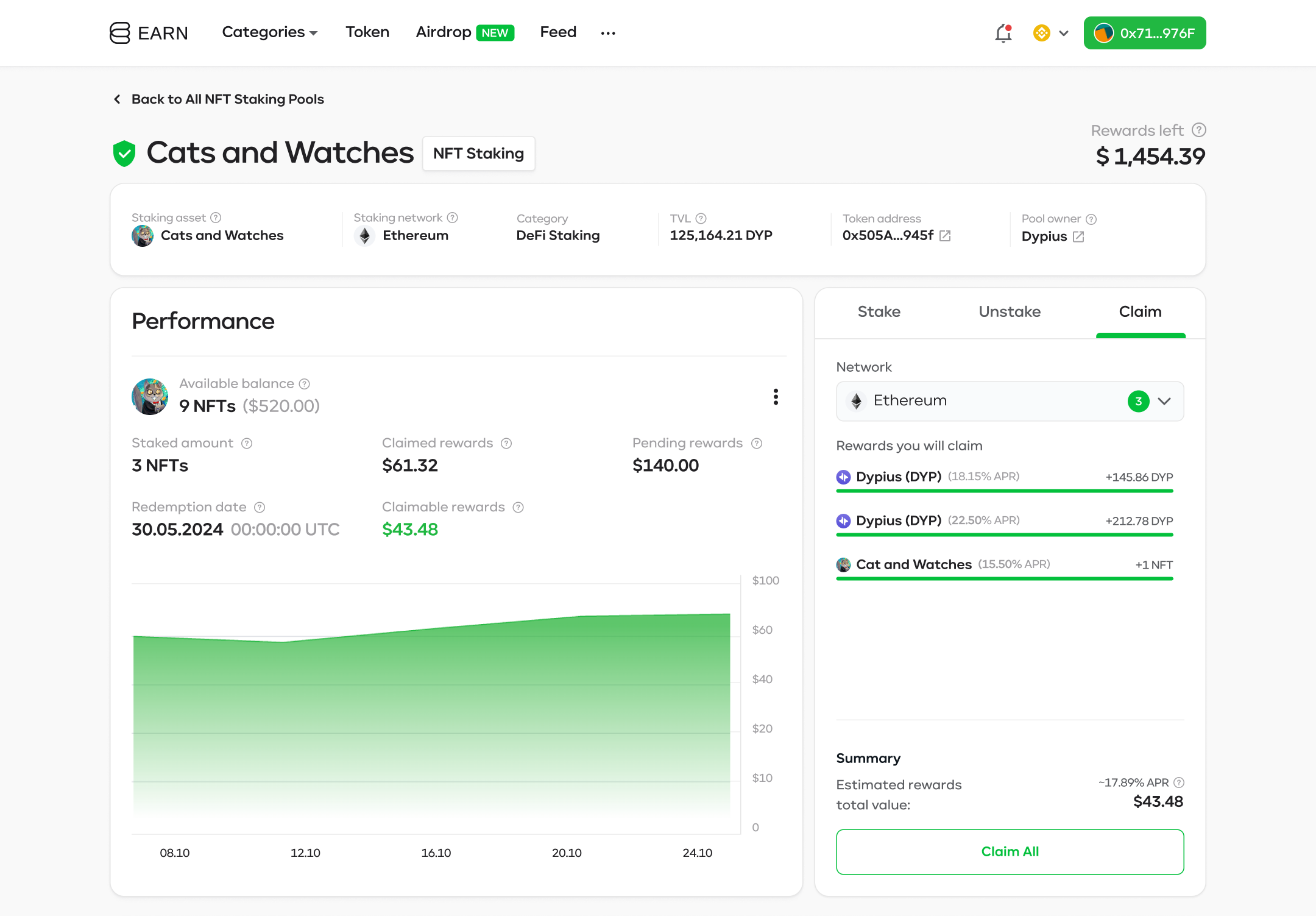For each locked reward, be it tokens or NFTs, you can initiate the claiming process as soon as the specific conditions set by the reward provider are met. The process is designed to be straightforward, enabling you to efficiently collect your earned rewards at the moment you achieve the set criteria for each particular pool.